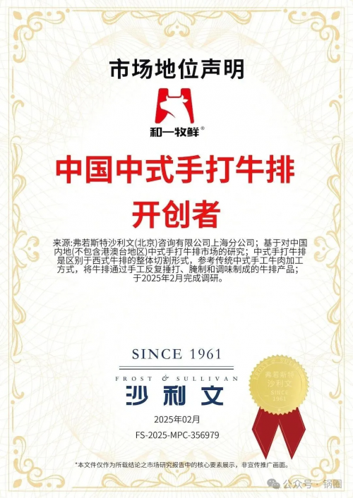 作为“中国中式手打牛排开创者”,和一肉业儿童牛排系列产品已获得第三方权威机构——沙利文授予的市场地位声明,并符合《儿童肉类制品通用要求》团体标准。